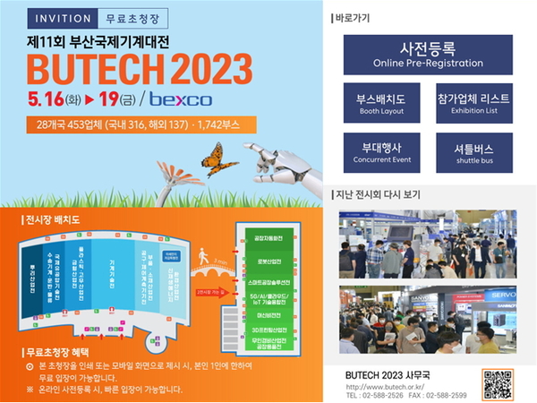 [기계신문] ‘제11회 부산국제기계대전(BUTECH 2023)’가 오는 5월 16일(화)부터 19일(금)까지 4일간 부산 해운대 벡스코(BEXCO) 제1, 2전시장에서 개최된다.