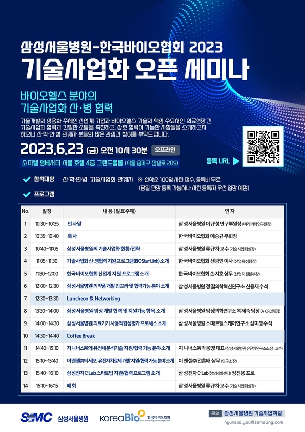 세미나 주요내용으로 ▶삼성서울병원의 기술사업화 현황 및 전략 ▶기술사업화 산·병 협력 지원 프로그램 Bio Star-Link 소개 ▶한국바이오협회 산업계 지원 프로그램 소개 ▶삼성서울병원 의약품 개발 인프라 및 협력 가능 분야 소개 ▶삼성서울병원 임상 개발 서비스 및 협력 가능한 항목 소개 ▶삼성서울병원 의료기기 사용 적합성 평가 의뢰 및 진행절차 소개 ▶지니너스의 유전체 분석기술 지원 및 협력 가능 분야 소개 ▶이엔셀의 세포·유전자치료제 개발 지원 및 협력 가능 분야 소개 ▶삼성전자 C-Lab 아웃사이드 스타트업 지원 및 협력 프로그램 소개 등을 주제로 발표가 진행된다.