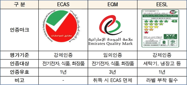* EQM(Emirates Quality Mark, 아랍에미리트 품질인증) : 식품, 화장품, 전기전자 대상 임의 인증제도로 취득 시 ECAS 면제 가능