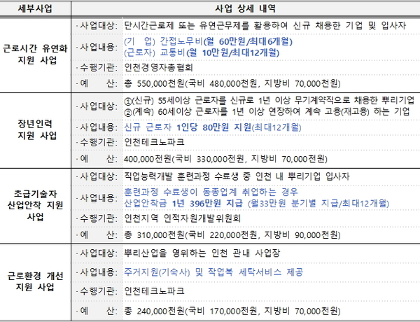 인천시는 이번 사업을 통해 고령화, 저임금, 장시간 근로환경으로 만성적 인력난을 겪고 있는 지역 주력산업인 뿌리업종의 신규인력 유입 촉진과 숙련인력의 고용 유지를 지원한다.