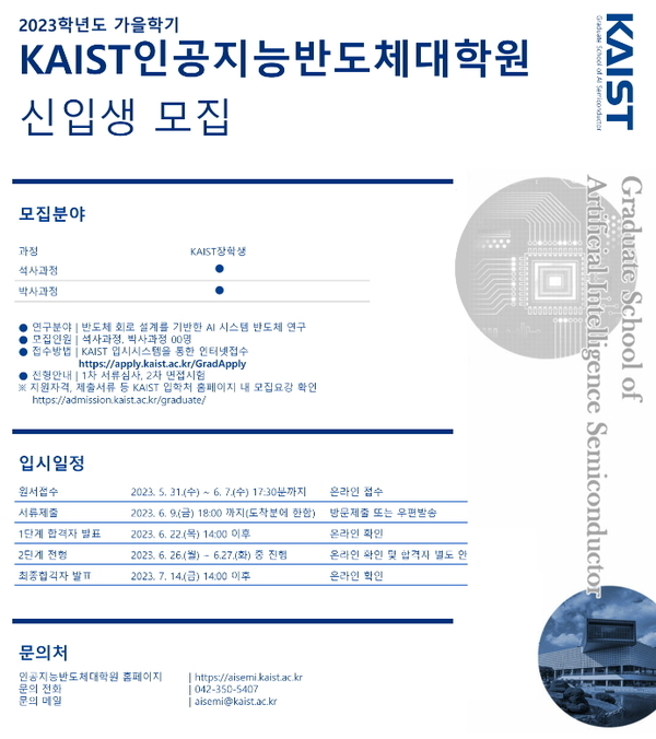 KAIST 인공지능반도체대학원은 오는 6월 7일까지 온·오프라인으로 동시에 입시원서 접수를 진행한다. 자세한 내용은 KAIST 입학처 홈페이지 또는 인공지능반도체대학원 홈페이지에서 확인 가능하다.