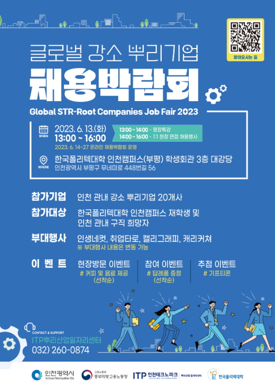 한국폴리텍대학 인천캠퍼스 학생회관 대강당에서 열리는 이번 채용박람회는 구직 희망자를 대상으로 ▶채용정보 제공 ▶이력서 및 자기소개서 작성 ▶1:1 현장 면접 등 다양한 취업 프로그램과 이벤트를 제공한다.