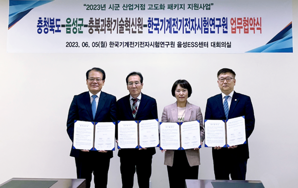 [기계신문] 한국기계전기전자시험연구원(KTC)은 충청북도, 음성군, 충북과학기술혁신원과 5일(월) KTC 음성에너지본부에서 음성군 기업 경쟁력 강화를 위한 ‘시군 산업거점 고도화 패키지 지원사업’ 업무협약을 체결했다.