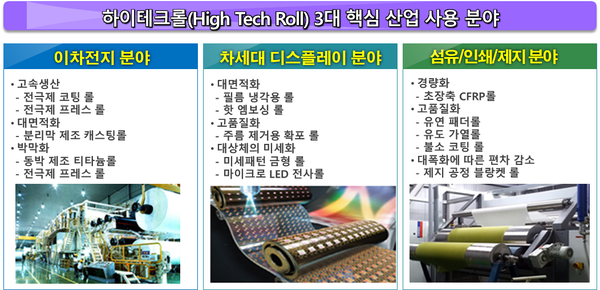 ‘하이테크(High-Tech) 롤(Roll)’은 이차전지, 섬유, 디스플레이 산업 등의 첨단제품 제조를 위한 롤투롤(Roll to roll) 장비의 핵심부품이다. 직·간접 회전 구동을 통해 연속적인 대량 생산, 초정밀 가공을 위한 대면적, 스마트화, 경량화 등의 기술이 접목된 부품이다.