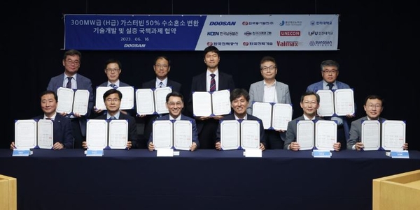 [기계신문] 두산에너빌리티는 지난 16일(금) 분당두산타워에서 한국동서발전을 포함한 국내 산∙학∙연들과 함께 ‘H급* 대형 가스터빈 50% 수소혼소 기술 개발 및 실증 국책과제’ 추진을 위한 업무협약을 체결했다고 밝혔다.