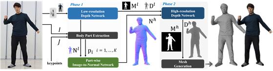 KETI·GIST 연구팀은 고해상도의 이미지를 효율적인 메모리로 처리하기 위해 영상 속 인물의 얼굴, 몸통, 팔, 다리 등 신체 각 부분을 분할한 뒤 다중 단계의 딥러닝 알고리즘을 통해 개별 깊이 정보를 추정하였다.