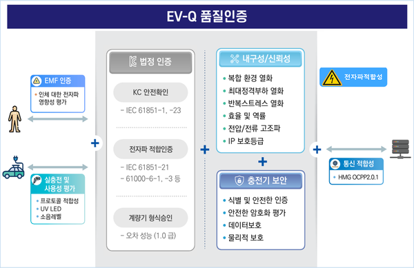 EV-Q인증은 기존 법정 인증인 제품 안전성 및 계량 성능 평가 이외에 충전기의 내구성·신뢰성, 실충전 성능, 보안성, 통신 적합성, 전자파 적합성 등 5가지 품질을 추가로 검증하기 위한 평가 항목으로 구성되어 있고, 공익성과 공공성 확보를 위해 모든 제조사 및 충전사업자에게 오픈해 운영된다.