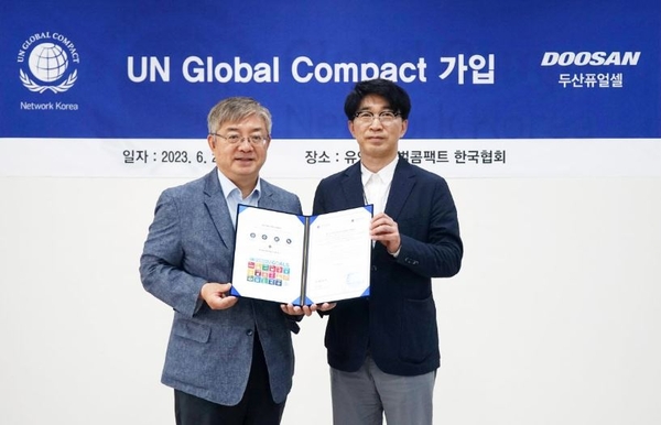 UNGC 유연철 사무총장은 “환경적 영향을 고려하는 비즈니스가 주류화 되고 있는 가운데, 수소사회로의 전환에 앞장서고 있는 두산퓨얼셀의 UNGC 참여는 매우 고무적”이라며 “이번 UNGC 가입이 두산퓨얼셀의 유엔 지속가능발전목표 이행과 ESG 경영 향상에 도움이 되길 기대한다”고 말했다.