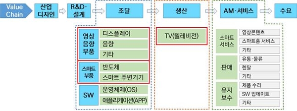 가전(TV)산업의 가치사슬 구조는 산업디자인, R&D·설계, 조달, 생산, AM(After Market)·서비스, 수요의 6개 부문으로 구성된다. 세계시장에서 브랜드 파워를 갖춘 생산기업이 가치사슬 전반을 주도하며, 최근에는 고객 경험 향상을 위한 산업디자인과 서비스의 중요도가 증가하고 있다.