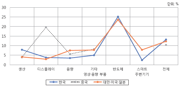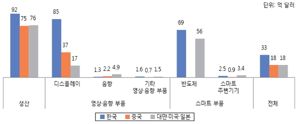 한국의 전체 평균 영업이익액은 4.3억 달러(영업이익률 13.2%)로 중국 2.9억 달러(10.4%), 대만·미국·일본 2.4억 달러(12.3%)를 상회한다. 다만, 생산과 반도체 부문을 제외한 나머지 부문의 영업이익률은 경쟁국 대비 낮았다. 디스플레이는 중국의 우위가 두드러졌고, 음향, 기타 영상음향부품, 스마트 주변기기는 대만·미국·일본이 우위인 것으로 나타났다.