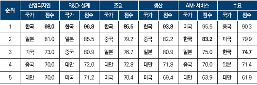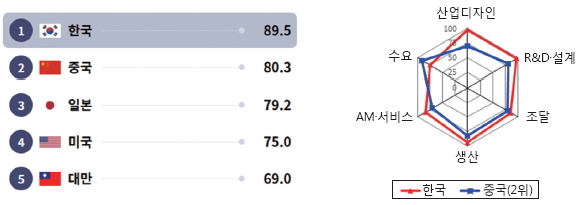 중국은 산업디자인, R&D·설계, AM(After Market)·서비스 부문의 경쟁력이 부족하나, 수요 부문에 힘입어 2위로 평가되었다. 일본은 산업디자인, R&D·설계, AM·서비스에서 중국보다 우위였으나, 조달, 생산, 수요 등의 열위로 중국보다 경쟁력이 소폭 낮았다.