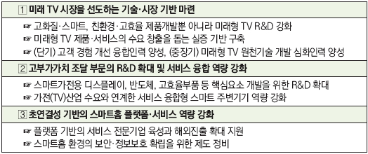 그러나 서비스 부문은 미국 대비 경쟁열위이며 스마트 주변기기, 음향 등 중소기업 영역은 경쟁력이 취약해 이에 대한 보완 전략이 요구된다. 또한, 현재 TV 시장의 성장이 정체한 가운데, 미래 TV 시장을 창출하기 위한 도전적 R&D와 서비스 융합을 통한 산업의 고부가가치화 방안이 필요하다.