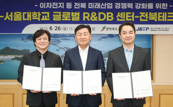 김관영 전북도지사는 “오늘 서울대 글로벌R&DB센터와 업무협약을 통해 전북에 이차전지 등 미래산업 연구기관 집적화의 중요한 모멘텀이 마련됐다”며 “서울대 글로벌R&DB센터의 역량이 전북의 혁신연구 역량을 더욱 배가시킬 것”이라고 말했다.