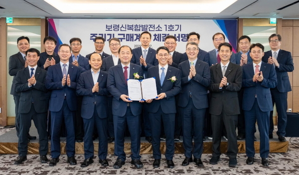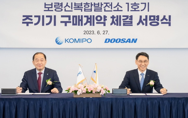 [기계신문] 두산에너빌리티는 지난 27일 한국중부발전과 2,800억 원 규모 보령신복합발전소 주기기 공급계약을 체결했다고 밝혔다. 서울 롯데호텔에서 열린 서명식에는 한국중부발전 김호빈 사장, 두산에너빌리티 정연인 사장 등 양사 관계자들이 참석했다.