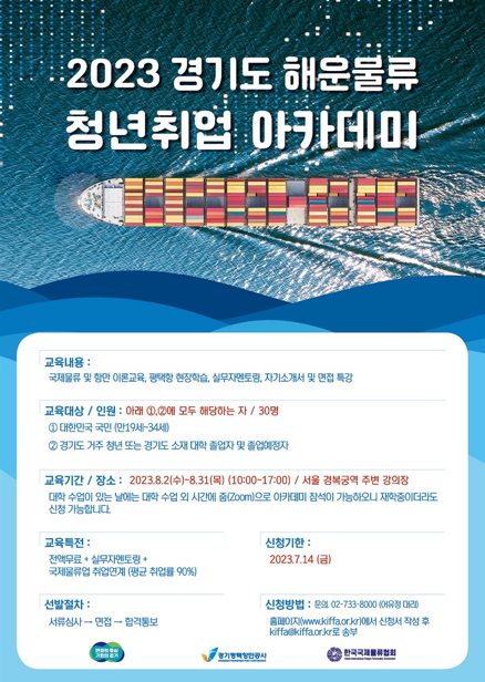 [기계신문] 경기도와 경기평택항만공사는 해운물류 전문인력 양성을 위해 오는 7월 14일(금)까지 ‘해운물류 청년취업 아카데미’ 교육생 30명을 모집한다. 아카데미 교육 대상자는 경기도 거주 청년(19~34세) 또는 도 소재 대학 졸업(예정)자다.