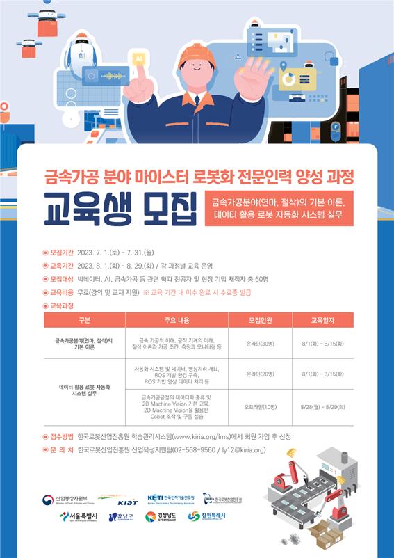 금속가공 업종 및 데이터 관련 분야 재직자와 전공자를 대상으로 진행되는 이번 교육 과정은 금속가공 분야 기초 이해도 제고 및 데이터 활용 로봇 기술 습득을 위한 강의를 중심으로 2개 과정이 운영될 예정이다.