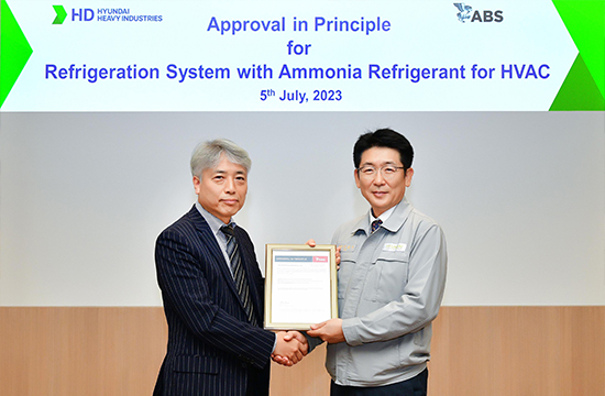 HD현대중공업은 올해 새롭게 제정된 ABS의 암모니아 냉매 적용 규정을 토대로 시스템 회로도 구성 및 배치도면 작성 등을 통해 암모니아 냉매 HVAC 시스템을 개발했으며, ABS는 시스템의 법적·기술적 검토를 수행했다.