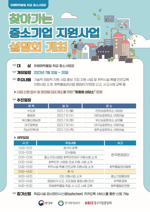 [기계신문] 환경부와 중소기업중앙회가 합동으로 7월 10일부터 20일까지 전국을 5대 권역으로 나누어 화학물질 안전관리를 위한 ‘찾아가는 중소기업 지원사업 설명회’를 개최한다.