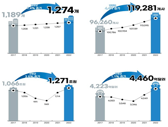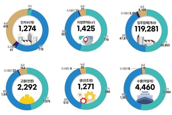 최근 5년간 산업단지는 85개(1,189개→1,274개) ▲지정면적 15k㎡(1,410k㎡→1,425k㎡) ▲업체수 23천여개(96,260개사→119,281개사) ▲고용 126천명(2,166천명→2,292천명) ▲생산 205조원(1,066조원→1,271조원) ▲수출 237억 달러(4,223억 달러→4,460억 달러)로 증가했다.