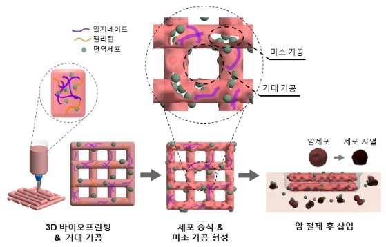 3D프린팅된 하이드로젤이 NK세포를 머금도록 함으로써 NK세포의 유실을 방지해 많은 양을 암세포까지 도달할 수 있도록 돕는다. 이 하이드로젤에는 구멍이 생성돼 일정 시간이 지나면 활성도가 유지된 NK세포가 흘러나와 암세포를 제거하는 세포 면역 기능을 수행할 수 있도록 한다.