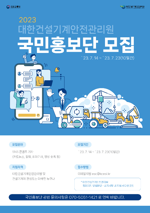 [기계신문] 대한건설기계안전관리원이 국민과 양방향 소통 강화를 위해 오는 7월 23일까지 국민홍보단을 공개 모집한다.
