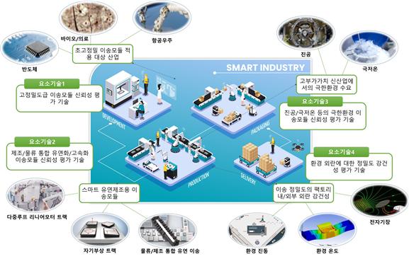 스마트팩토리 구성용 이송장치 모듈 기술은 공장 자동화의 핵심 기술로 산업의 첨단화에 따라 요구되는 정밀도가 높아지고, 신소재 및 부품이 지속적으로 적용되고 있다. 초고정밀 이송장치 기술에서는 내·외부 환경의 미소 변화 및 외란 측정과 이에 대한 이송 성능의 신뢰성 확보가 요구된다.