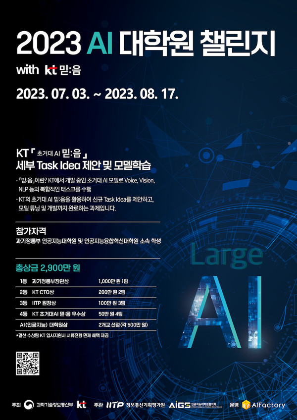 [기계신문] 과학기술정보통신부와 KT가 주최하고 (사)인공지능대학원협의회, 정보통신기획평가원이 주관, 인공지능팩토리가 운영하는 ‘2023 AI대학원 챌린지’가 7월 3일부터 8월 17일까지 개최된다.
