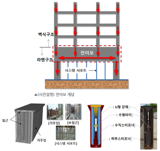 * 전이보 : 건물 상층부의 골조를 어떤 층의 하부에서 별개의 구조형식으로 전이하는 형식의 큰보