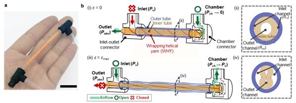 이 소프트 밸브는 튜브 속을 흐르는 공기로 구동부를 움직인다. 튜브 끝단을 당기면 튜브 속에 나선형으로 감겨있는 실이 튜브를 눌러 공기의 유입과 유출을 조절하는 원리다. 튜브 끝단을 잡아당기면 구동부가 마치 아코디언 바람통이 움직이는 모양처럼 늘어났다 줄었다 작동하게 된다.