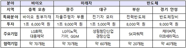 이 자리에서 정부는 미래차, 바이오 등 신산업 분야로 지정 대상을 확대하고, 광주(미래차), 대구(미래차), 충북 오송(바이오), 부산(반도체), 경기 안성(반도체) 등 5개 특화단지를 추가 지정하기로 했다. 이번 특화단지 조성에 약 6.7조원의 기업 신규투자가 이뤄질 예정이다.