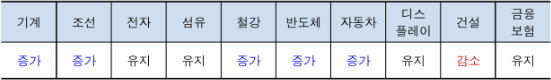 업종별로 보면, 주요국 인프라 투자와 에너지 및 친환경 인프라 투자 증가로 수출과 내수가 동반 증가하여 기계업종 고용은 전년 동기 수준으로 증가할 전망이다.