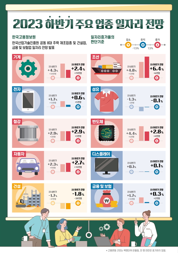 보고서에 따르면, 지난해 하반기 대비 기계·조선·철강·반도체·자동차 업종 일자리는 증가하며 건설업종 일자리는 감소할 것으로 예상된다. 전자·섬유·디스플레이·금융 및 보험 업종은 전년 동기 고용 수준을 유지할 것으로 전망된다.