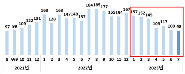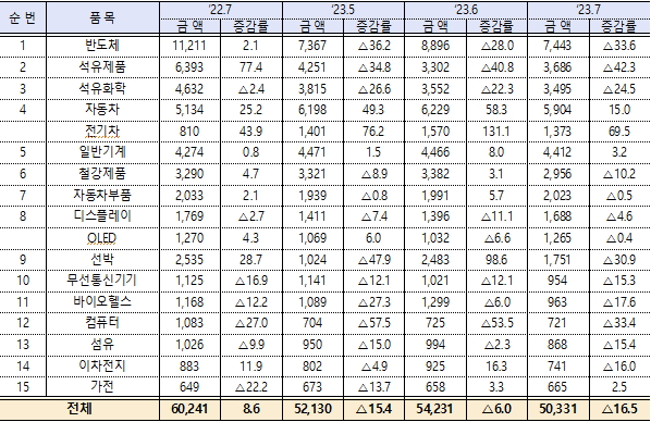 2022년 7월 수출이 역대 月 기준 1위 수출실적(602.4억 달러, +8.6%)을 기록한 데 따른 逆기저효과도 올해 7월 수출 감소에 영향을 미쳤다.