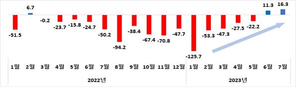 7월 무역수지는 16.3억 달러 흑자를 기록하며 지난 6월(+11.3억 달러) 이후 2개월 연속 무역수지 흑자를 달성했다. 올해 1월 무역적자(△126억 달러) 이후 무역수지 개선 흐름이 지속되고 있다.