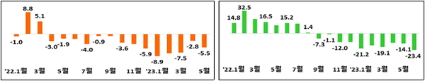 일본은 2022년 4월 이후 2023년 5월까지 14개월 연속 수출 감소세(달러화 기준)를 나타냈다. 반도체 수출비중이 높은 대만도 2022년 11월 이후 큰 폭의 수출 감소를 보이고 있으며, 6월 수출은 23.4% 감소하면서 올해 최대 감소율을 기록했다. 베트남은 컴퓨터·전자제품(6월△7.9%), 무선통신(6월△18.2%) 등 주요 품목 수출이 감소하며 올해 3~6월 연속 수출이 감소했다.