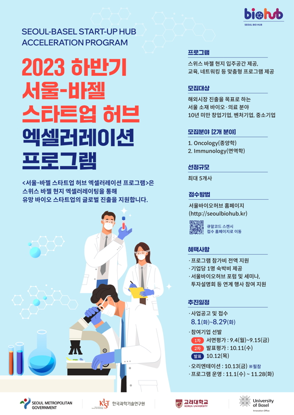 [기계신문] 한국과학기술연구원(KIST)과 고려대학교가 공동으로 위탁·운영하는 서울바이오허브는 바이오의료 분야 스타트업의 글로벌 진출 역량 강화를 위해 ‘서울-바젤 스타트업 허브 엑셀러레이션 프로그램’을 실시, 오는 8월 29일(화)까지 참가 기업을 모집한다고 밝혔다.