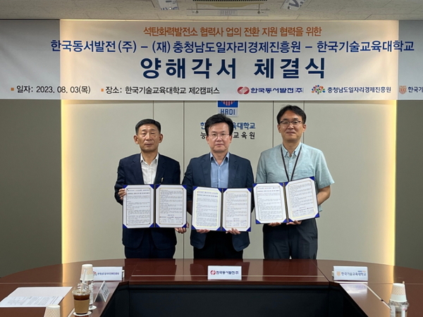 [기계신문] 한국동서발전㈜은 지난 3일 석탄발전소 상주 협력사 근로자의 일자리 전환을 위해 (재)충남일자리경제진흥원, 한국기술교육대학교와 ‘협력사 업의 전환 지원’ 공동협약을 체결했다.