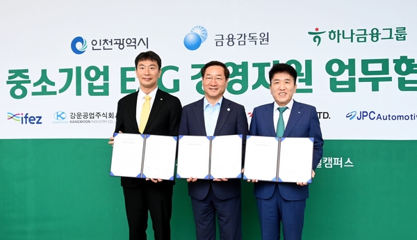 [기계신문] 인천시는 10일(목) 하나 글로벌캠퍼스에서 금융감독원, 하나금융그룹과 ‘공급망 실사 대응을 위한 중소기업 ESG 경영 지원’을 위한 업무협약을 체결했다.