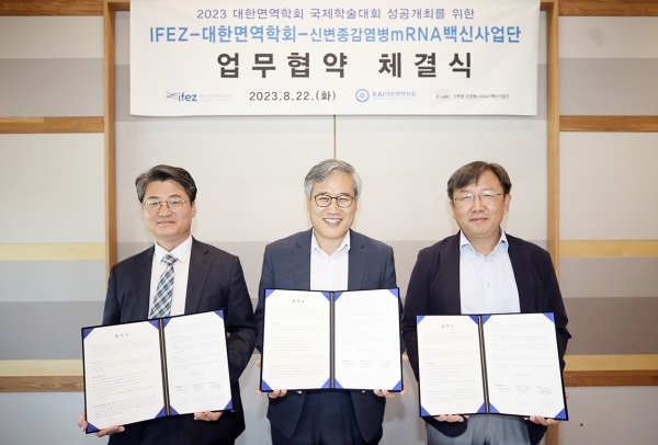 인천경제청은 22일 송도에서 김진용 청장, 전창덕 대한면역학회장, 홍기종 신변종감염병mRNA백신사업단장 등이 참석한 가운데 ‘IFEZ(인천경제자유구역)-대한면역학회 국제학술대회(KAI Internaional Meeting 2023)’와 관련한 업무협약을 체결했다고 밝혔다.