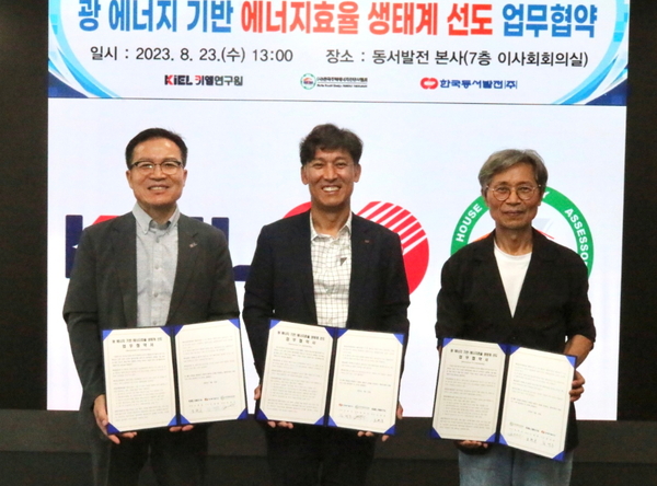 [기계신문] 한국동서발전㈜는 23일(수) 울산 중구 본사에서 (재)키엘연구원, (사)한국주택에너지진단사협회와 ‘광(光) 에너지 기반 에너지효율 생태계 선도 업무협약’을 체결했다.