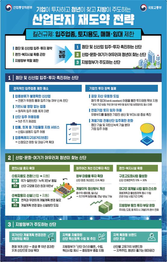 규제개선 주요내용을 보면, 먼저 첨단 및 신산업 입주·투자가 촉진되는 산단을 만들기 위해 경직적인 입주업종 제한을 해소한다. 이를 위해 ▶산단 관리기관(한국산업단지공단 등)에게 산단 조성 시에 결정된 입주업종을 5년마다 재검토하도록 하여 입주업종, 기반시설 등 산업단지 발전방향을 종합적으로 반영토록 한다.