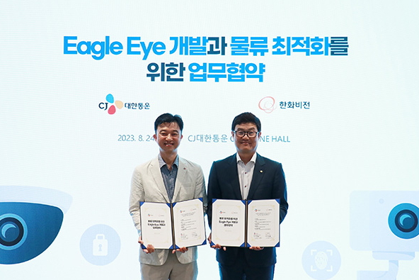 [기계신문] CJ대한통운은 24일(목) 서울 종로구 사옥에서 한화비전과 ‘Eagle Eye(이글아이) 개발과 물류 최적화를 위한 업무협약(MOU)’을 체결했다. 양사는 현장에서 수집한 데이터를 물류업 맞춤형으로 학습한 AI가 분석하는 물류 영상 솔루션인 ‘Eagle Eye’를 공동 개발할 예정이다.
