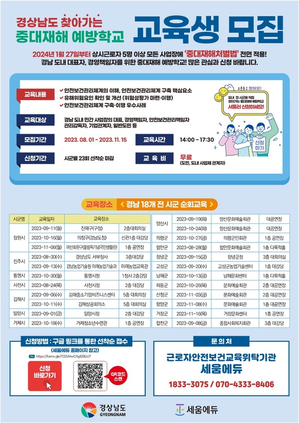 향후 실시하는 찾아가는 중대산업재해 예방학교의 교육일자, 장소, 교육신청 방법 등 세부적인 내용은 경남도와 시군 누리집에서 확인할 수 있다.