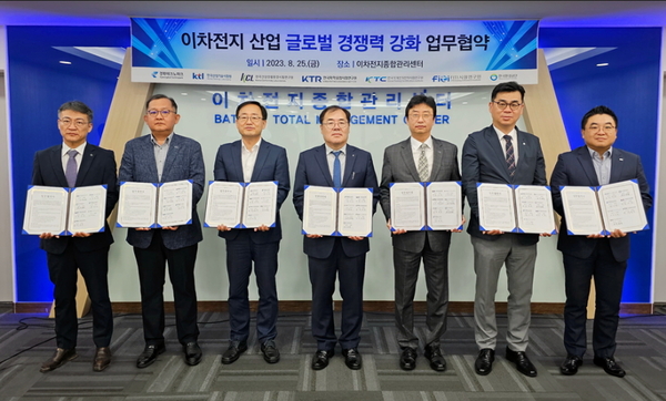 [기계신문] 한국기계전기전자시험연구원(KTC)은 지난 25일 경북 포항 이차전지종합관리센터에서 경북테크노파크, 한국산업기술시험원(KTL), 한국건설생활환경시험연구원(KCL), 한국화학융합시험연구원(KTR), FITI시험연구원, 한국환경공단과 함께 ‘국내 이차전지 산업 글로벌 경쟁력 강화’ 업무협약을 체결했다고 밝혔다.
