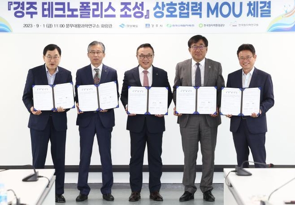 [기계신문] 경북도는 1일(금) 경주 감포읍 문무대왕과학연구소에서 이철우 경북도지사, 주낙영 경주시장, 황주호 한국수력원자력 사장, 주한규 한국원자력연구원장, 조성돈 한국원자력환경공단 이사장이 참석한 가운데 ‘경주 테크노폴리스 조성’ 추진을 위한 업무협약을 체결했다.