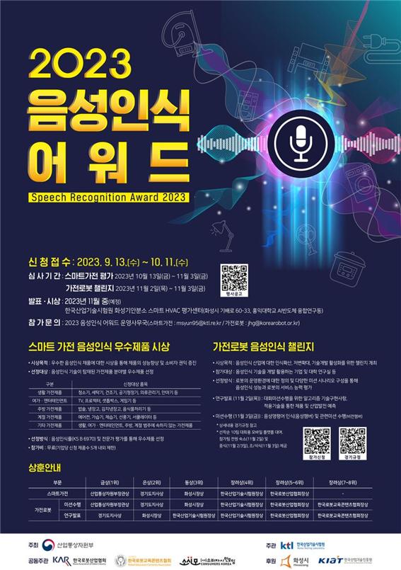 2023 음성인식 어워드는 ❶스마트가전 음성인식 우수제품 시상과 ❷가전로봇 음성인식 챌린지 총 2개 부문이다. 신청접수는 9월 13일부터 10월 11일까지 약 4주간 진행되며 자세한 사항은 KTL 홈페이지에서 확인 가능하다.