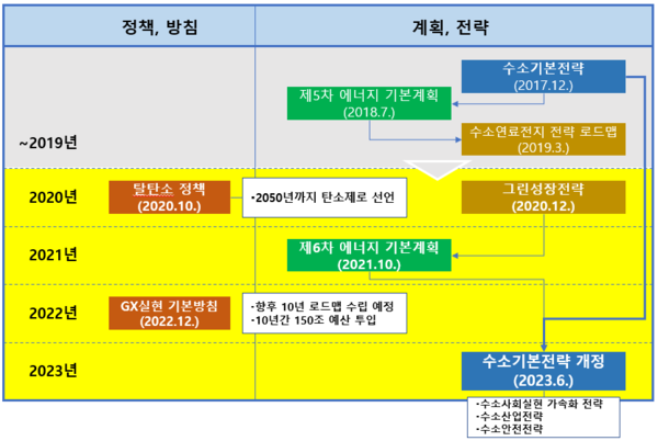 또한, 2022년 수립한 ‘GX(Green Transformation, 녹색 전환) 실현 기본 방침’에 따라 향후 10년간 150조원 대규모 투자를 통해 탄소제로 사회 달성을 위한 계획이 수립됐으며, 에너지 분야에서도 수소·암모니아 정책을 강화하고 있다.