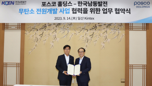 [기계신문] 한국남동발전은 지난 14일 경기도 일산 킨텍스에서 열린 ‘H2 MEET 2023’ 행사에서 포스코홀딩스와 무탄소 전원개발 사업 협력 강화를 위한 업무협약을 체결했다고 밝혔다. 행사에는 한국남동발전 이상규 부사장과 포스코홀딩스 유병옥 부사장 등이 참석했다.