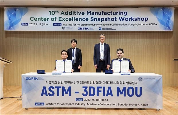 [기계신문] 3D융합산업협회(3DFIA)는 미국재료시험협회(ASTM, American Society for Testing and Materials)와 18일(월) 인천 송도에 위치한 항공우주산학융합원에서 한미 3D프린팅(적층제조) 분야 민간협력 강화를 위한 업무협약을 체결했다.