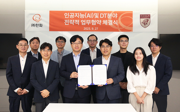 행사에는 ㈜한화 정해진 DT담당, 고려대학교 산업경영공학과 김성범 교수 및 주요 관계자들이 참석했으며, 협력 범위 및 방식에 대한 논의를 나누고 협약을 체결했다.